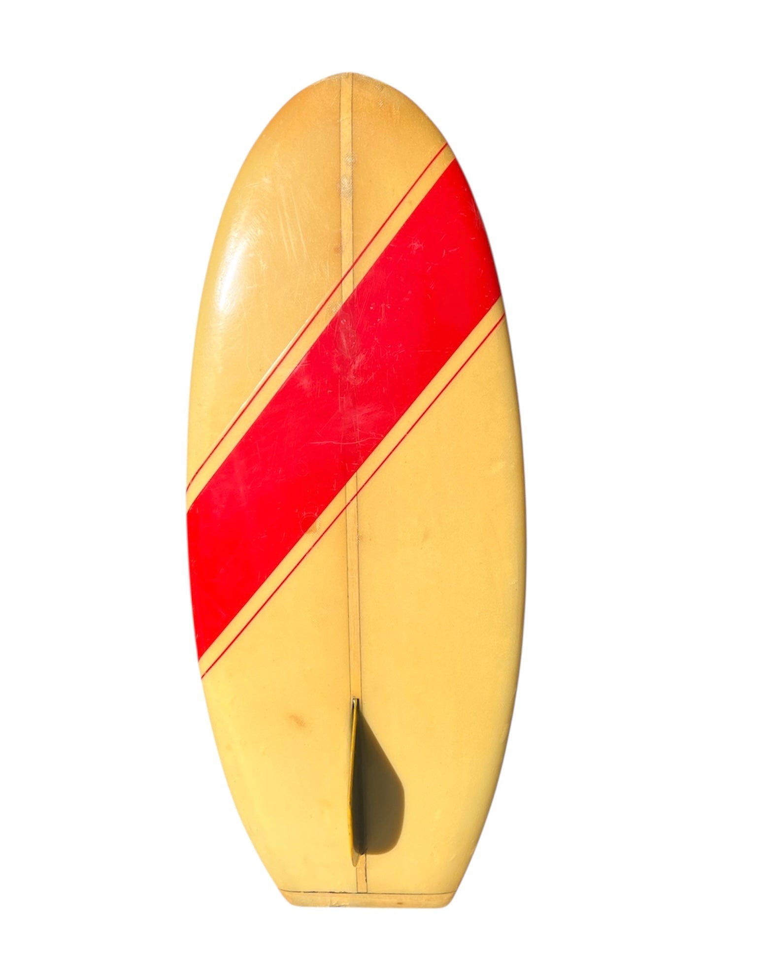 - Mini "D" fin, wood inlay tail blocks, red resin stripe